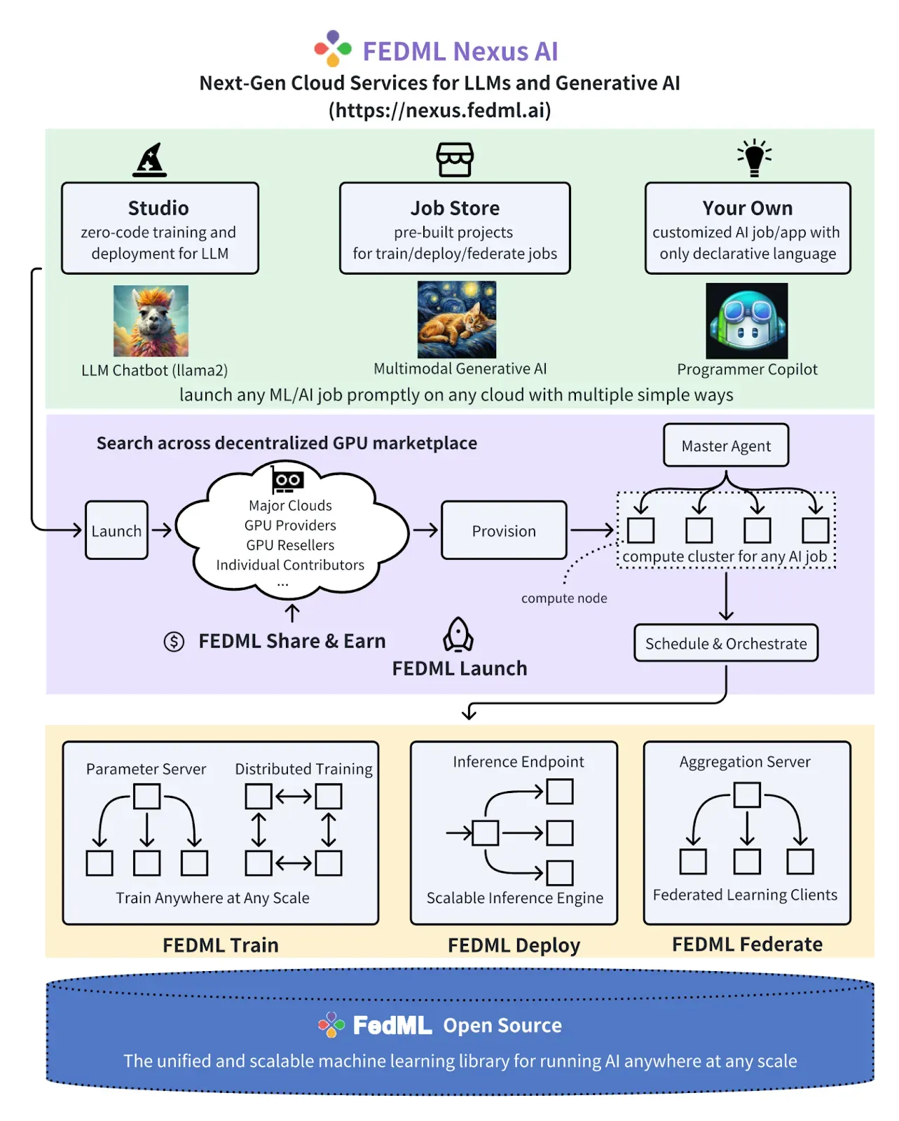 - Zero-code LLM Studio: As enterprises increasingly seek to create private, bespoke, and vertically tailored LLMs, FEDML Nexus AI Studio empowers any developer to train, fine-tune, and deploy generative AI models code-free. This Studio allows companies to seamlessly create specialized LLMs with their proprietary data in a secure and cost-effective manner.