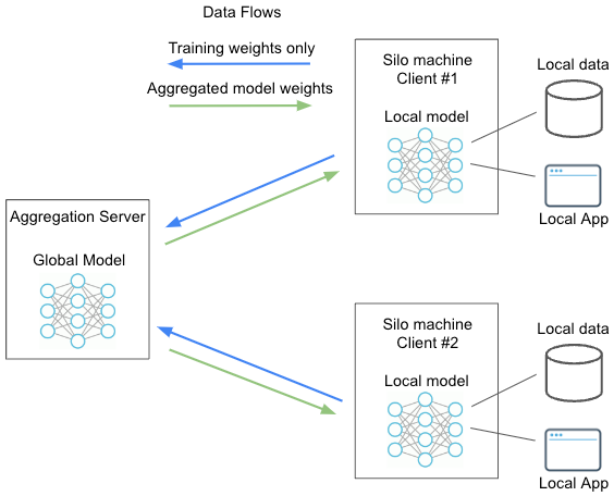 The following diagram represents a typical federated machine learning setup on FedML. Simplified here with only 2 clients or silo machines. The aggregation server and silo machines can be any machines you own and can be behind your firewall. The model is sent to the data, rather than traditional ML setup where the data is centralized or pooled for a central model. Hence, the local data never leaves the local model & local storage for training. Only the weights are transmitted back to an aggregation server, which aggregates the weights and delivers an updated global model back to the silo machines for additional rounds of training.