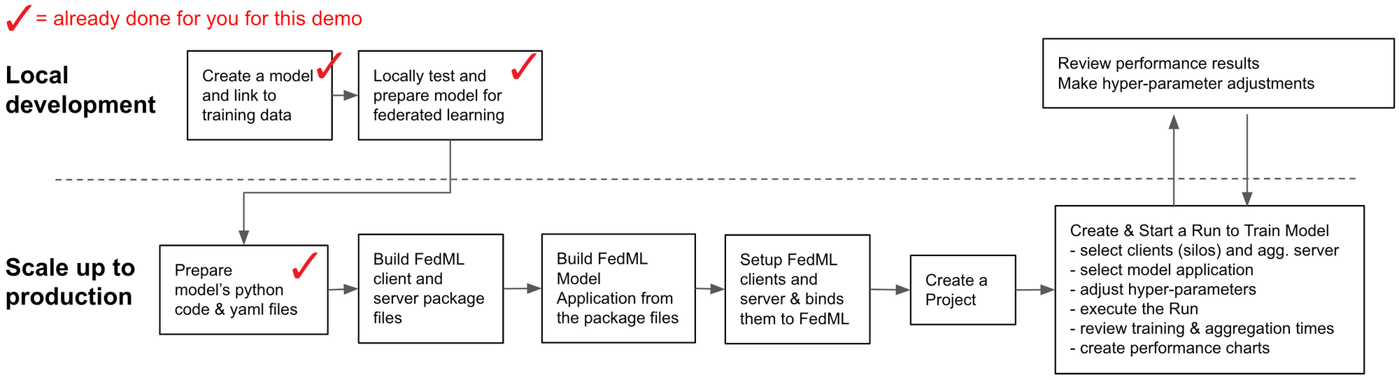 For experienced MLEs using FedML for the first time, we think you'll quickly see that our MLOps solution: is easy to use, removes many typical bottlenecks typically associated with MLOps and federated learning, and can scale to any need. For SDE or data scientists less experienced with federated learning, you'll see how easy FedML has made it to deploy a model in a federated learning manner.