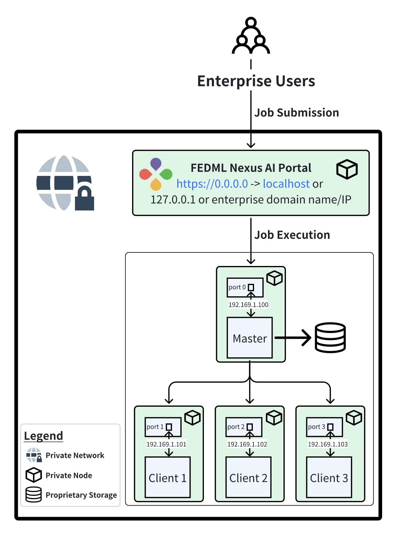 In the figure 2, we provide a representative example of the execution flow of a federated learning job deployed on-premise through FEDML Federate within an enterprise’s private network. FEDML Federate will spawn and manage the required master and client processes at the registered computing nodes and provide advanced job, model and system monitoring capabilities through the on-premise deployed FEDML Nexus AI Platform.
