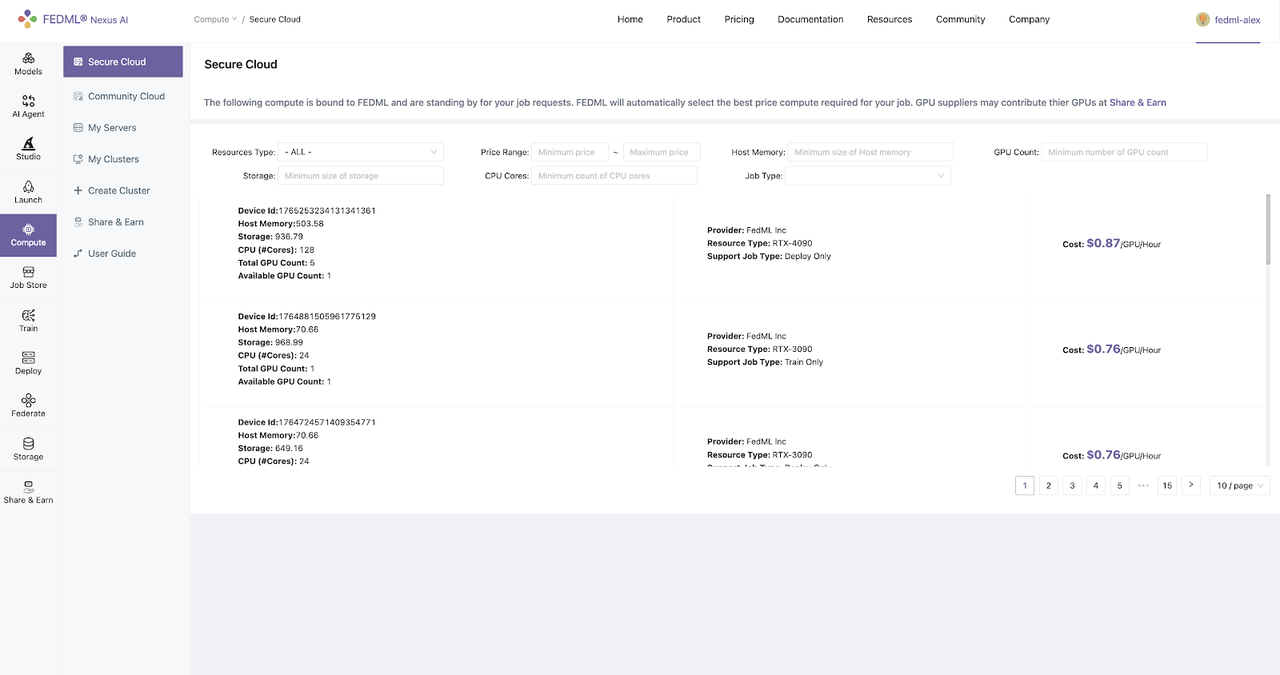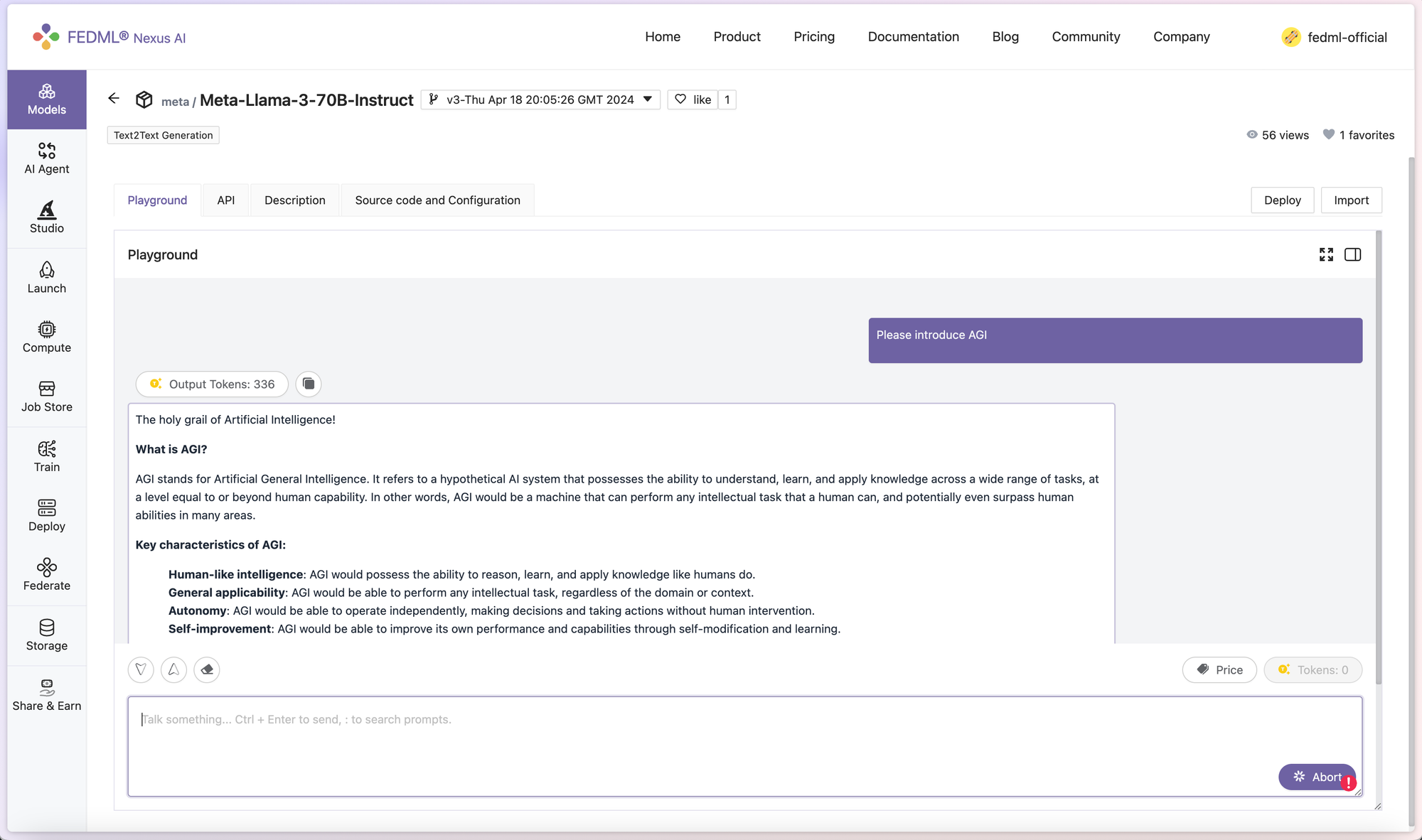- Fast model deployment: Once the fine-tuning is finished, at FEDML Nexus AI, you can use a few clicks to finish the deployment and turn your fine-tuned models into playground, APIs, and even AI Agents.