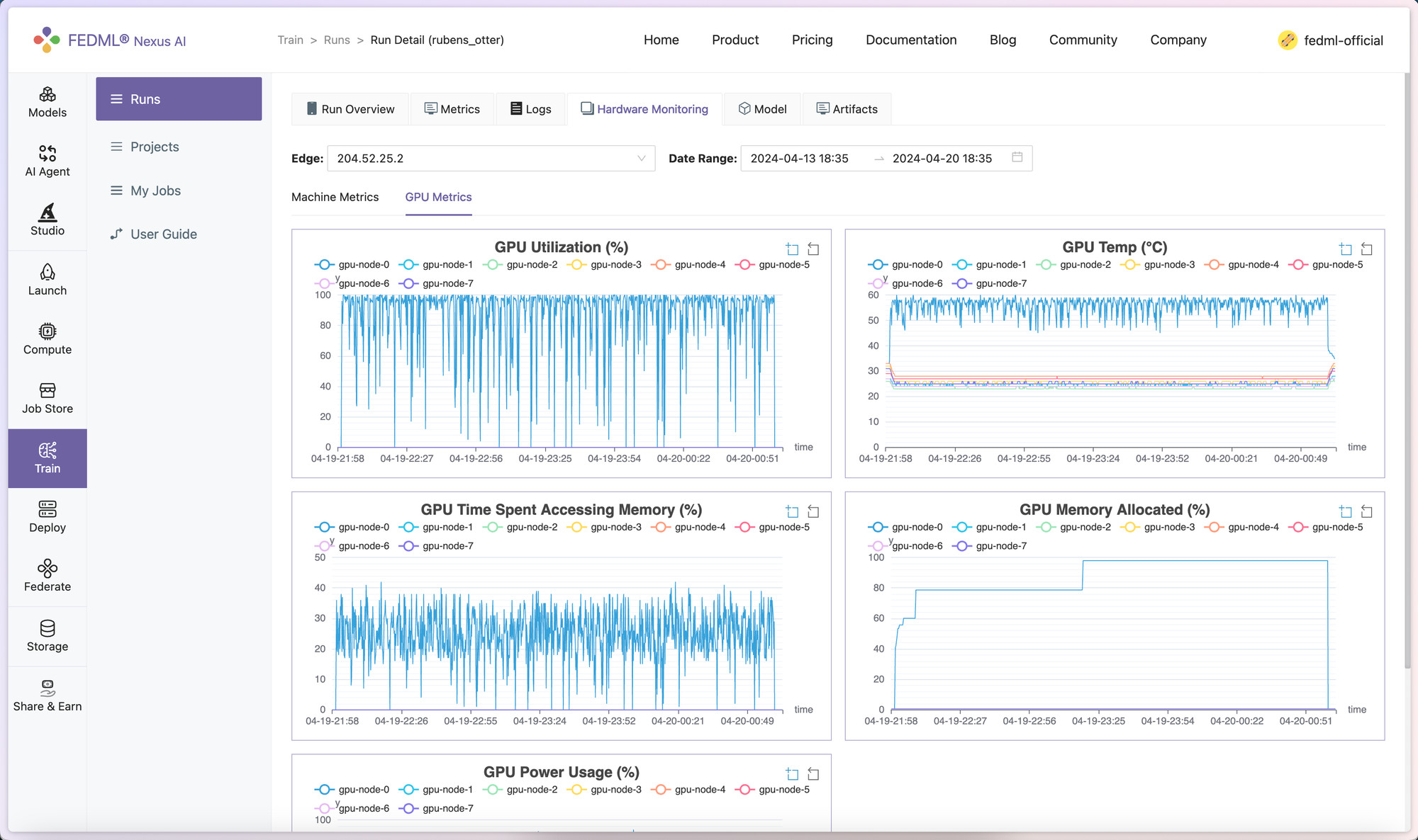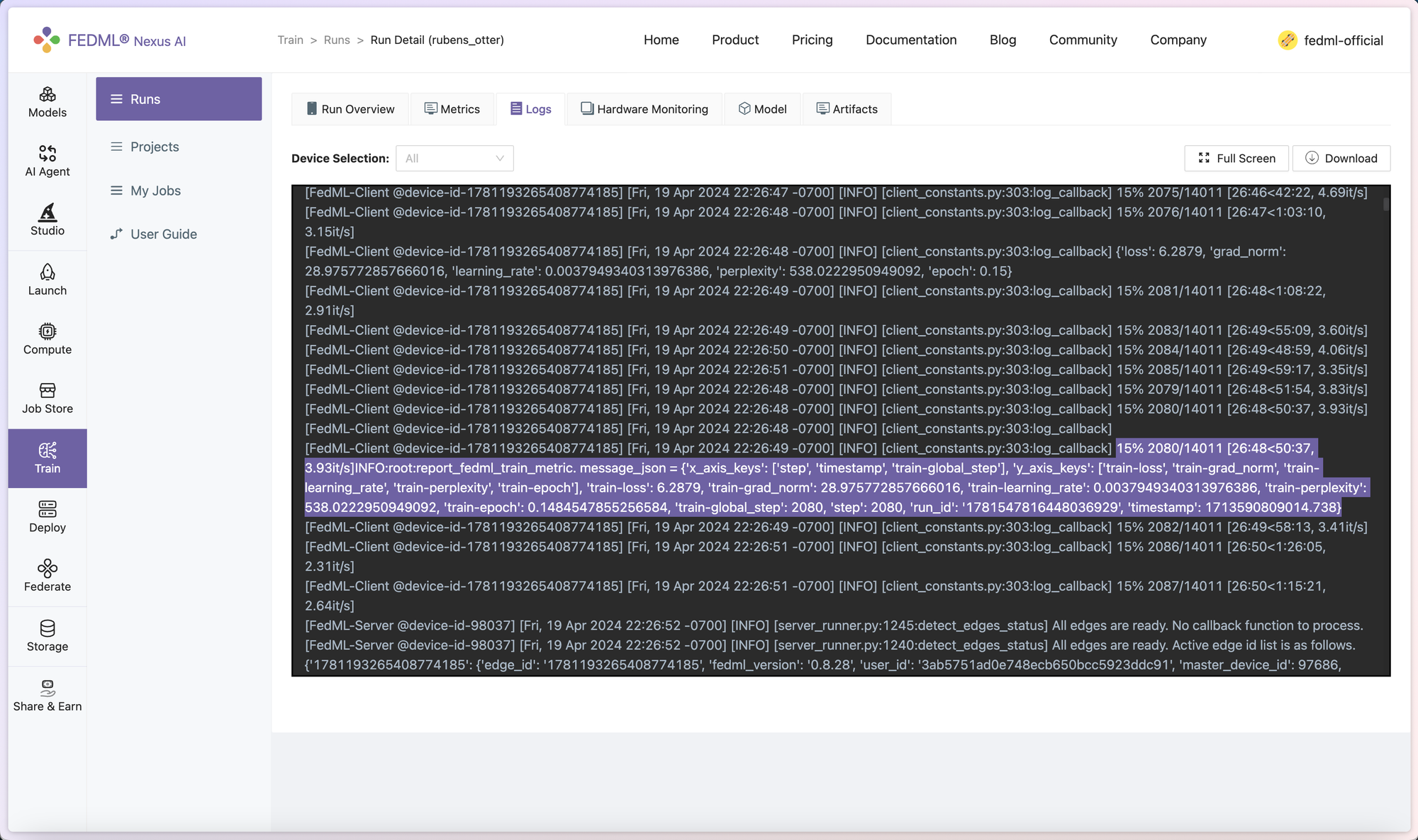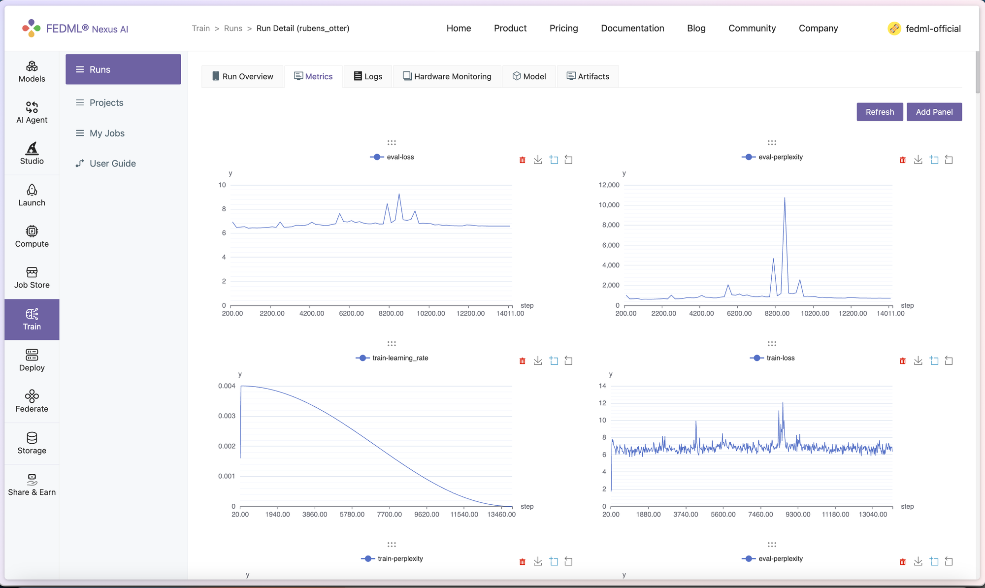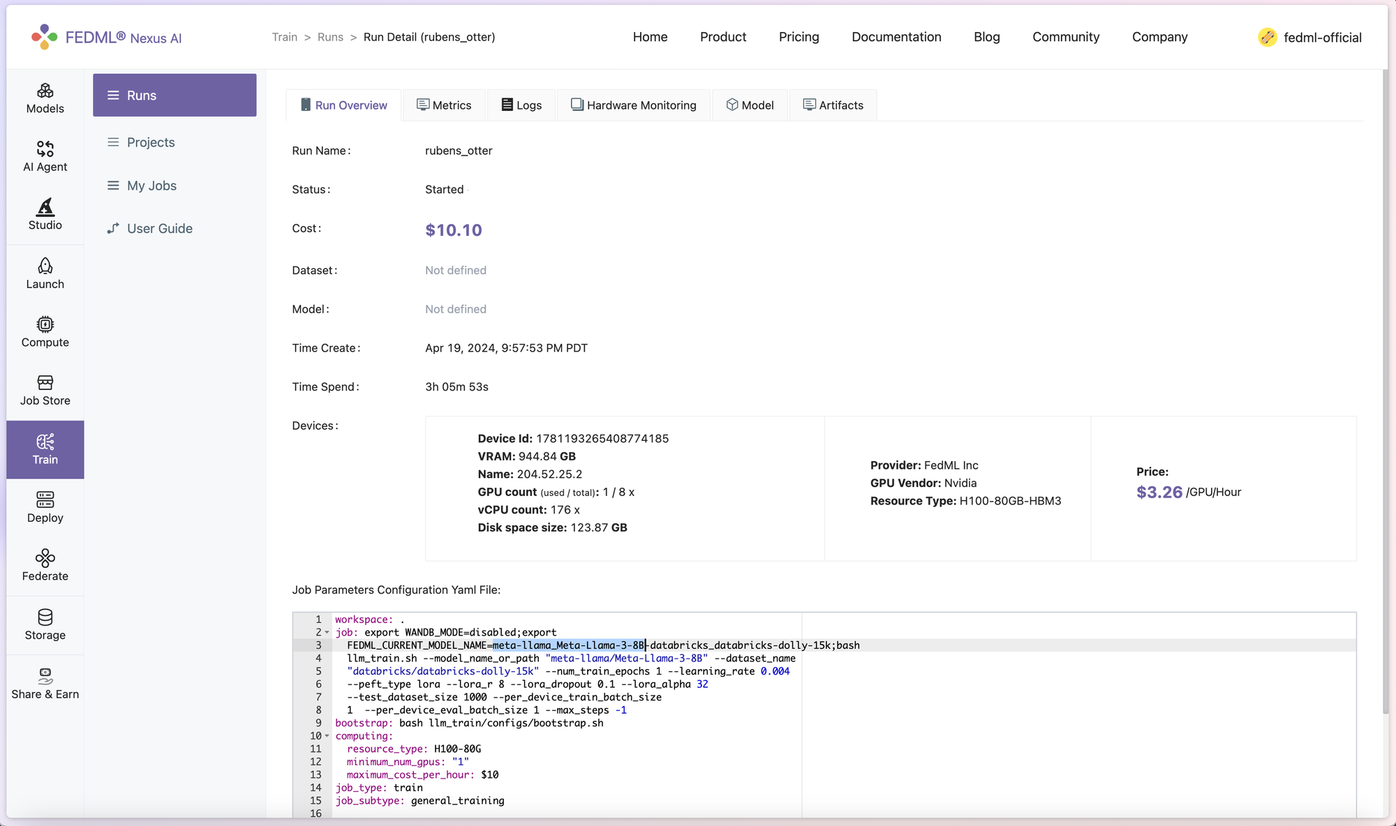 We also provide you the seamless user experience in experimental tracking, you don't need to switch to another AI platform to track run overview, metrics, logs, hardware, and model artifacts. The prebuilt Llama3 training job uses our API fedml.log() for tracking the experiments (https://doc.fedml.ai/open-source/api/api-experimental-tracking).