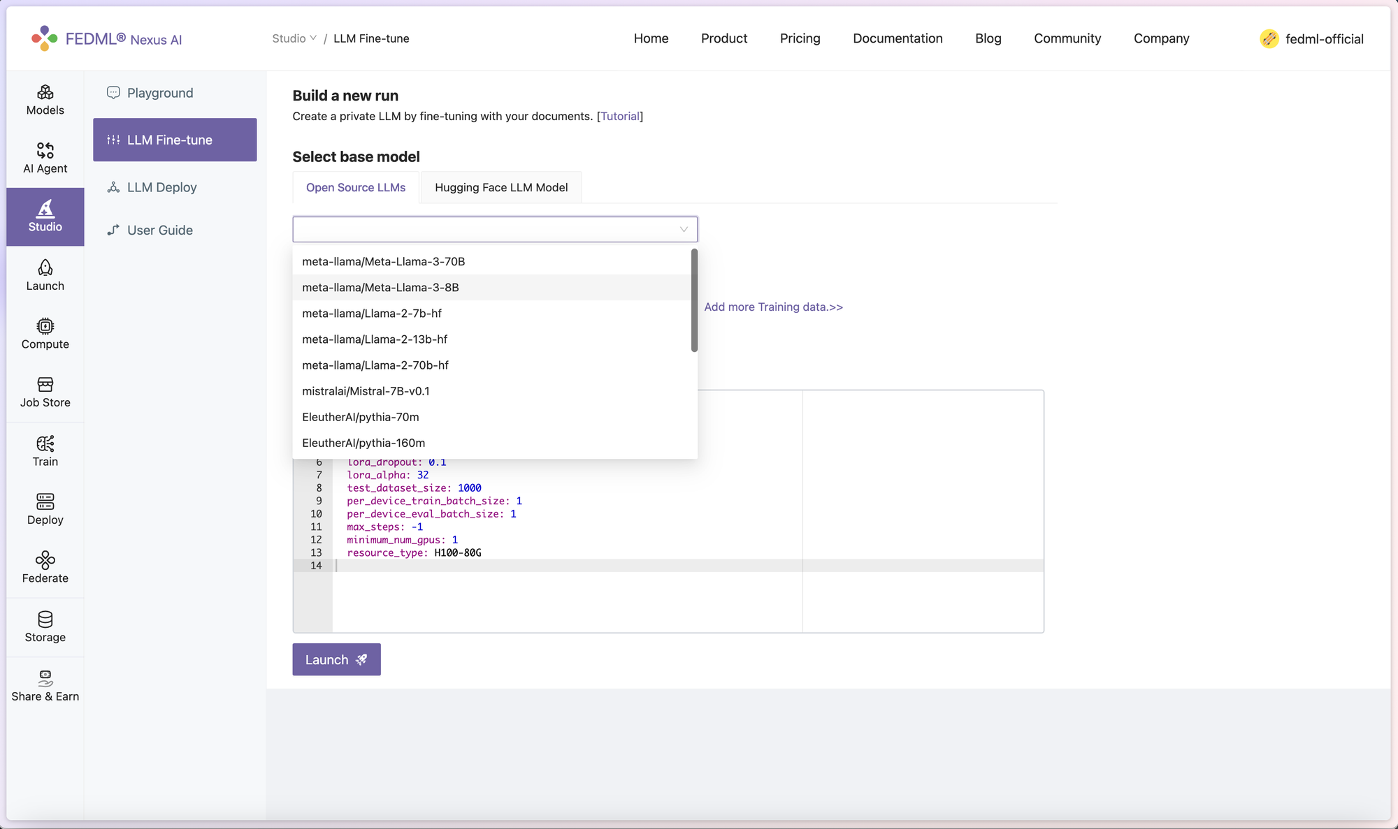You just need to log in to https://fedml.ai, switch to Studio - LLM Fine-tune, select the base model as Llama3-8B or Llama3-70B, select the prebuilt dataset, and then click "Launch".