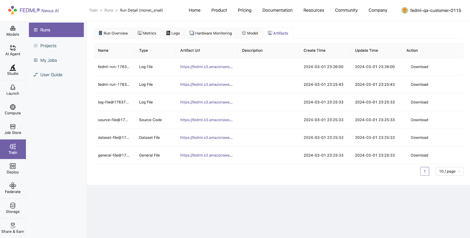 Artifacts logged using fedml.log_artifact() can be viewed under Runs > Run Detail > Artifacts on FEDML Nexus AI Platform.
