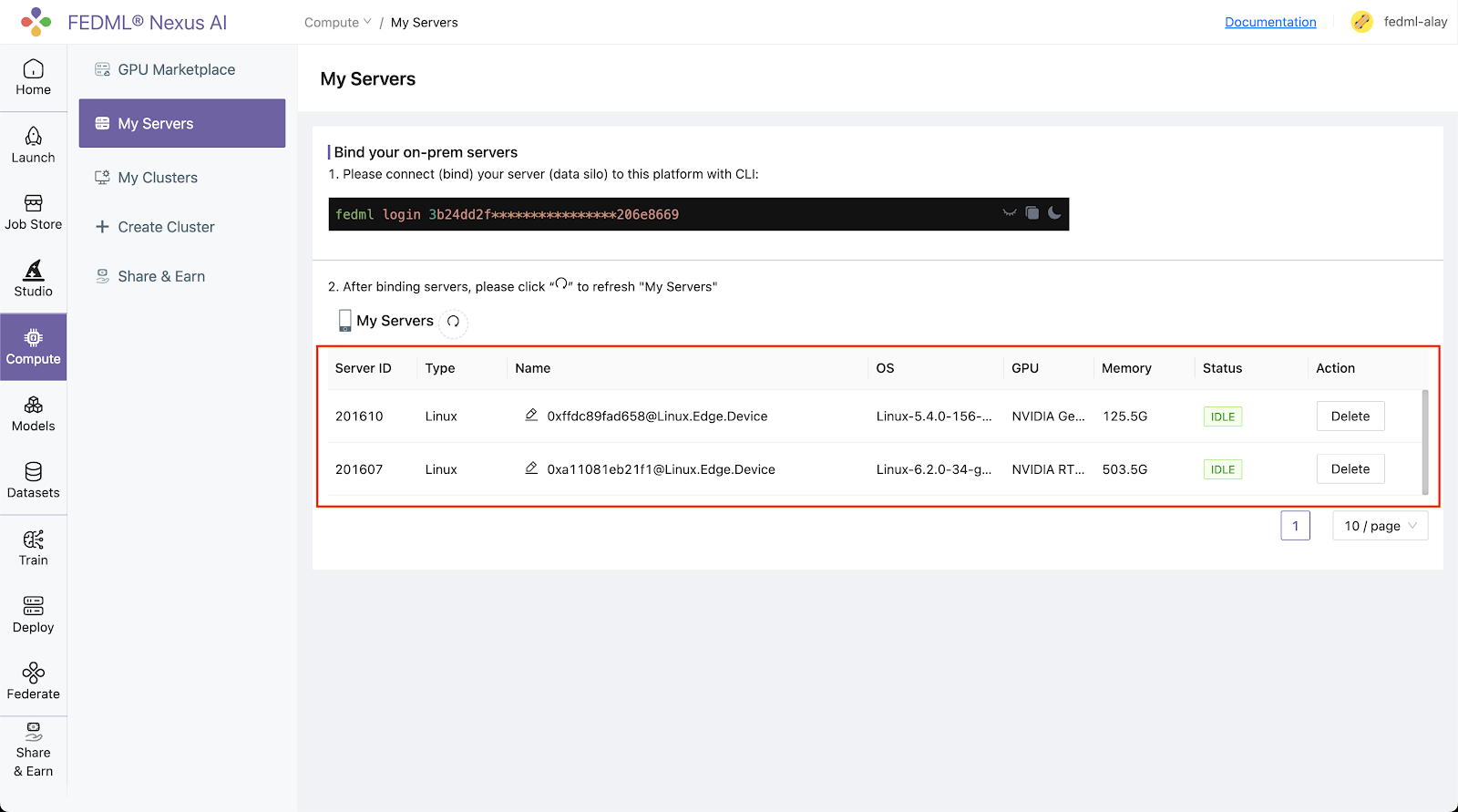 Head back to the Compute / My Servers page on platform and verify that the devices are bounded to the FEDML Nexus AI Platform:
