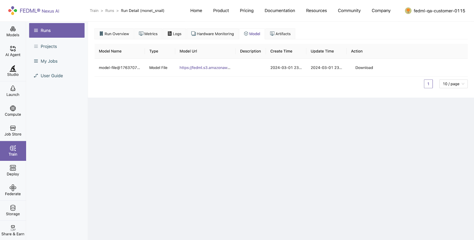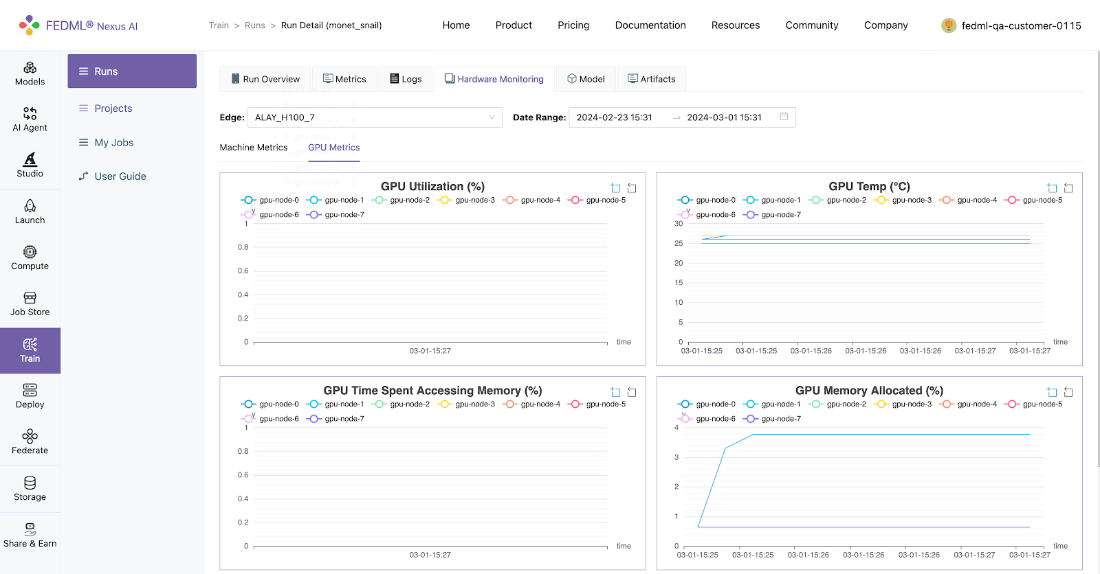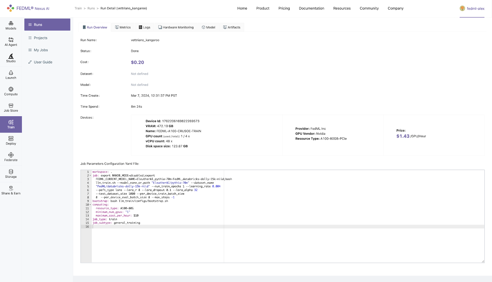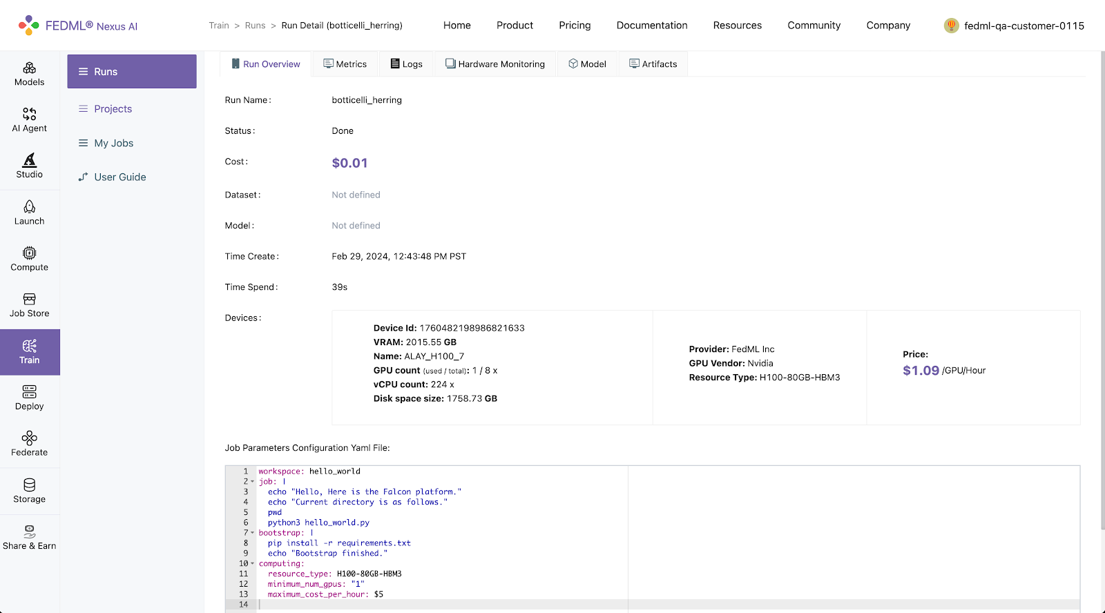 Log into to the FEDML Nexus AI Platform (https://fedml.ai) and go to Train > Runs. And select the run you just launched and click on it to view the details of the run.