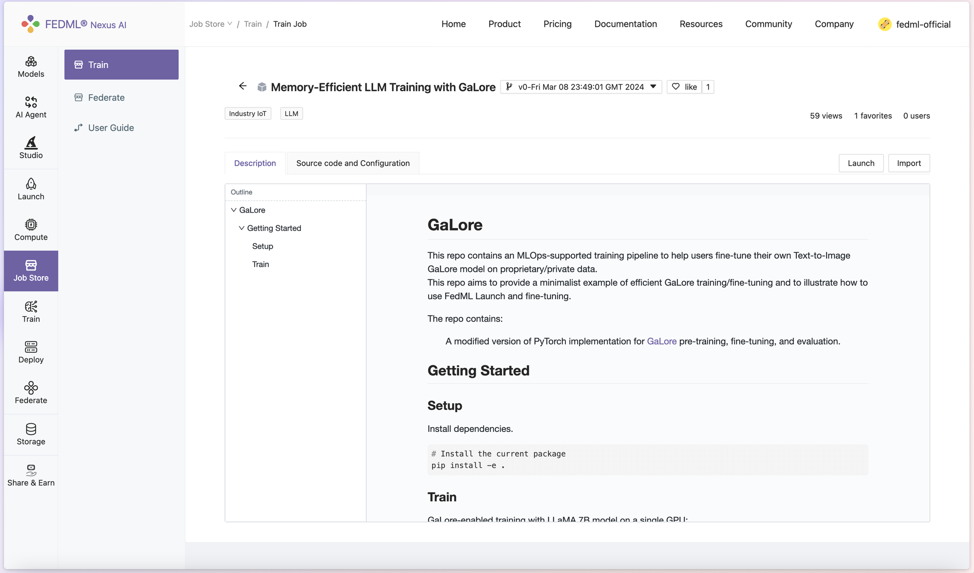 1. On FedML official website (https://fedml.ai/home), you can head to Launch > Job Store > Train, and look for Memory-Efficient LLM Training with GaLore job. The Description tab shows some basic usage for the code, referencing the original GaLore project's README. In the Source Code and Configuration tab, you can examine a more detailed layout and setup of the architecture.