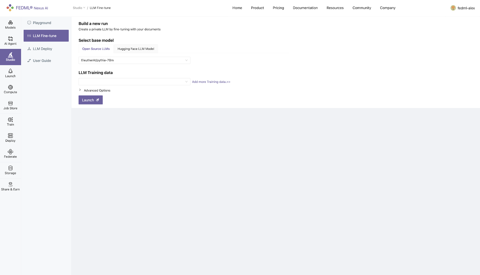 As an example of applying FEDML Launch for training service, LLM Fine-tune is the feature of FEDML Studio that is responsible for serverless model training. It is a no-code LLM training platform. Developers can directly specify open-source models for fine-tuning or model Pre-training.