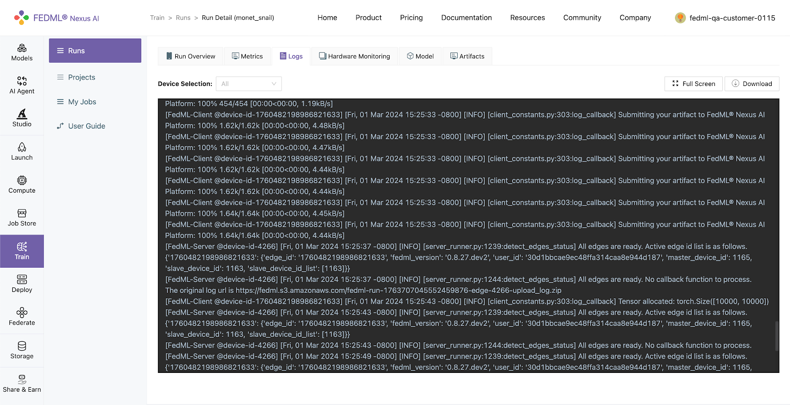Additionally, logs of the run also appear in realtime on the FEDML Nexus AI Platform under the Runs > Run Detail > Logs